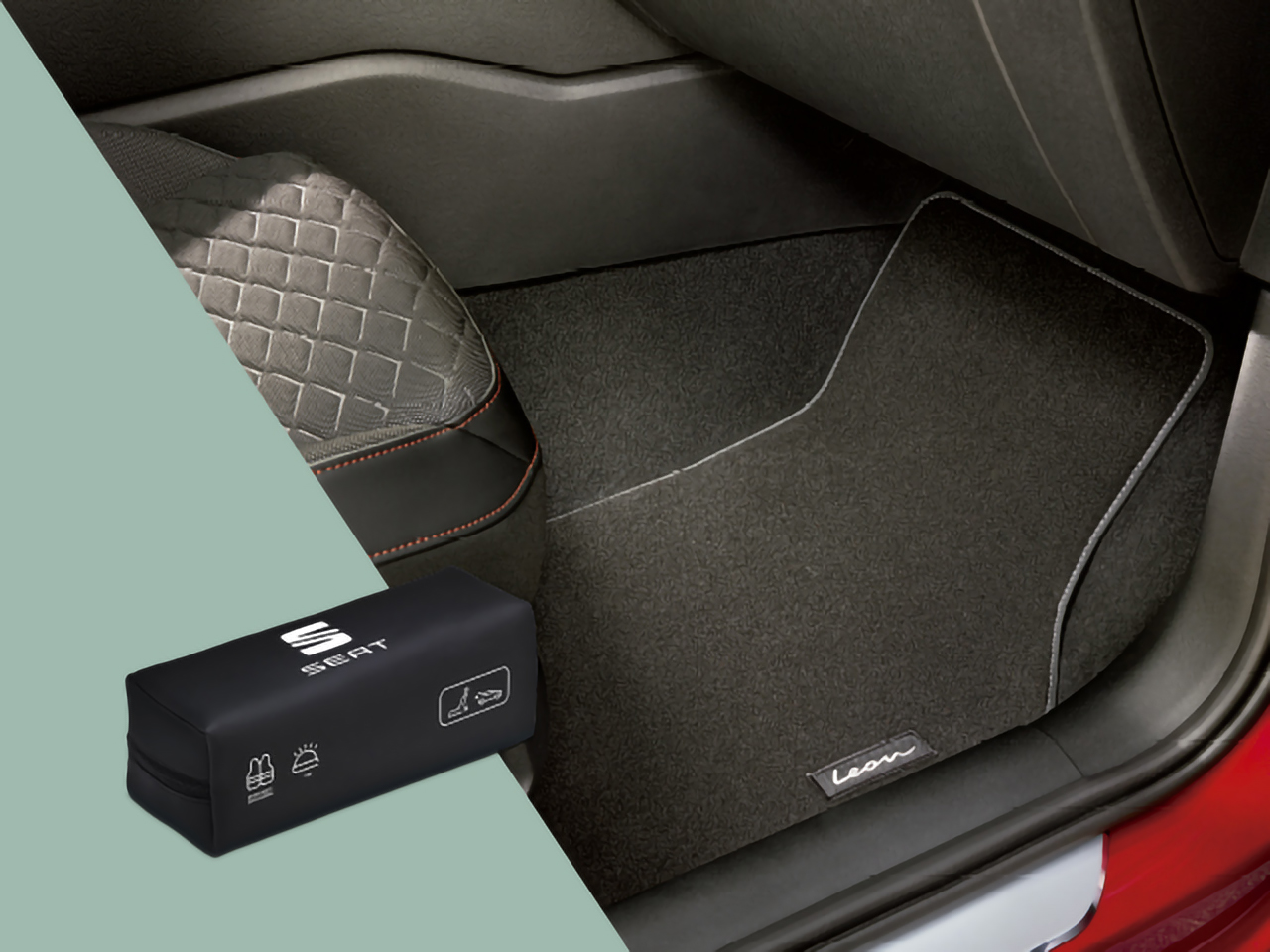 Mats: Standard mat with non-slip bottom, customised with Leon lettering, specific geometry for mHEV variants. Set of 4 pieces. For left-hand drive vehicles (LHD). Driver floor mat with fastening system.